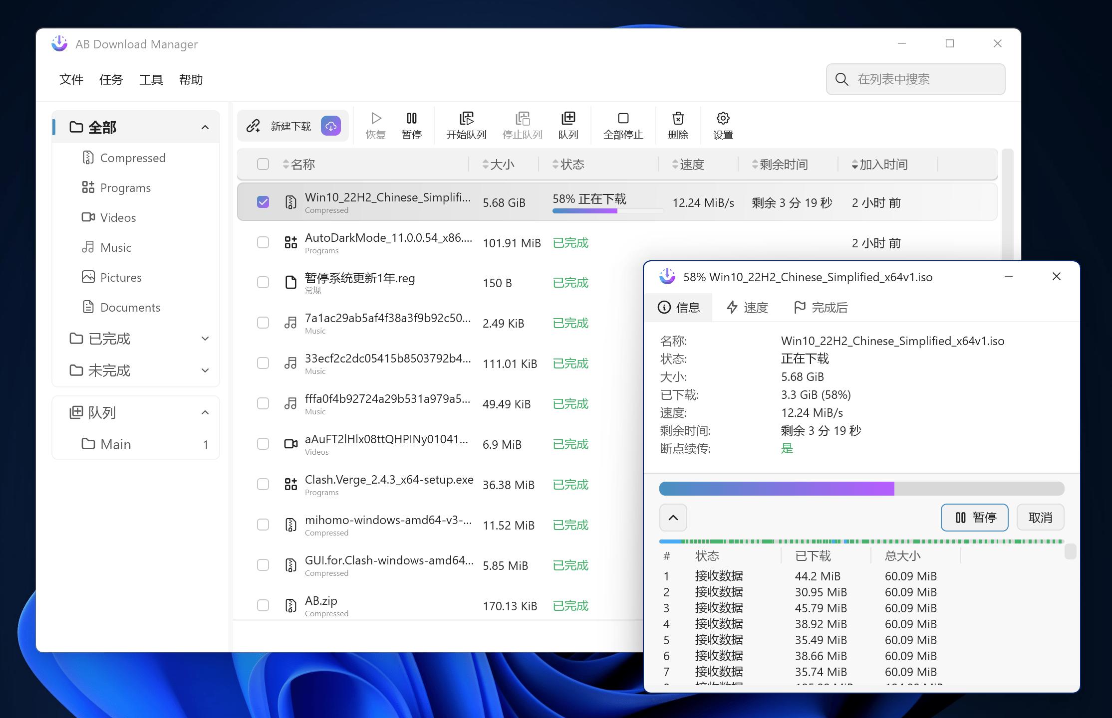 AB Download Manager(简称 AB DM)是一款开源且免费的下载管理器,面向 Windows(并有跨平台包/社区构建)的用户,主打多线程加速、队列与日程管理、浏览器扩展捕获链接等功能,是一款功能和体验上可替代 IDM 的轻量级下载工具。它界面现代、支持浏览器集成与下载断点续传,适合需要稳定高速下载与批量管理的用户。