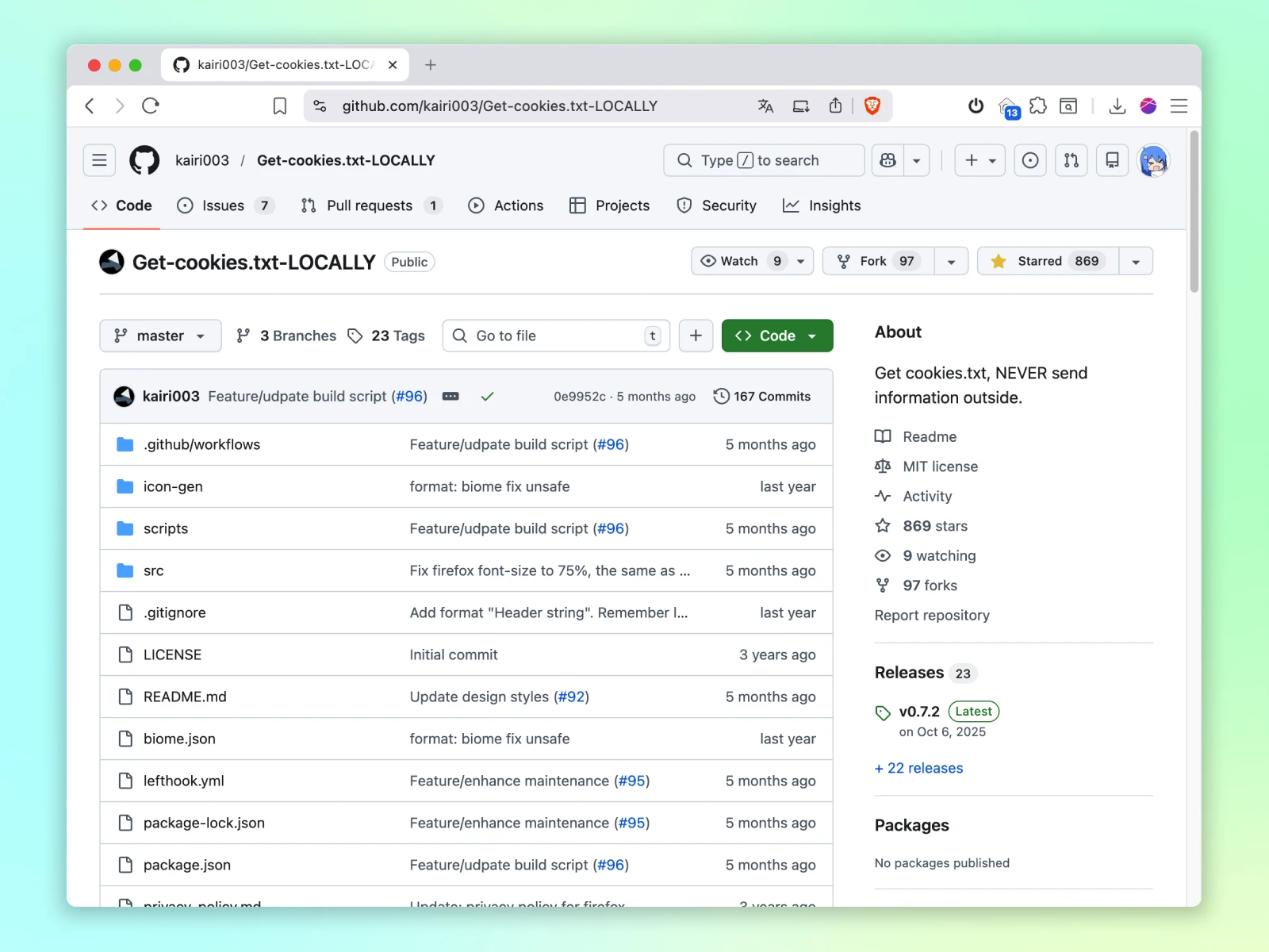 Get cookies.txt LOCALLY 是一款浏览器扩展工具,用于一键导出 / 复制当前网站的 cookies.txt 文件。