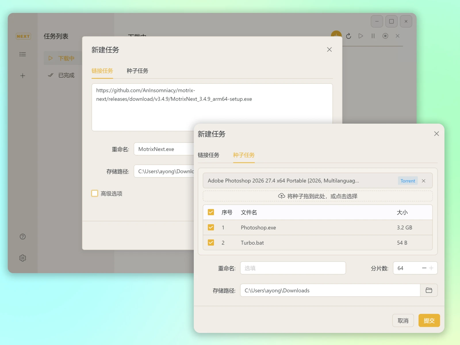 MotrixNext 支持 HTTP、FTP、BitTorrent 等协议的高速下载,便捷管理并加强了对大文件和多任务下载的处理能力,适合需要高效下载的用户。